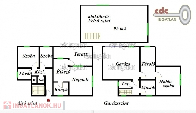 A ház földszintje 95 m2, itt egy nagy nappali, egy étkező, konyha, két hálószoba, gardrób és egy fürdőszoba, valamint egy mellékhelyiség található. A fűthető alagsorban egy 42 m2-es garázs és 60 m2 hasznosítható terület található. A ház emeleti szintje 95 m2, ami befejezésre vár. A villany-, víz- és csatorna kiállások már itt is ki lettek alakítva.