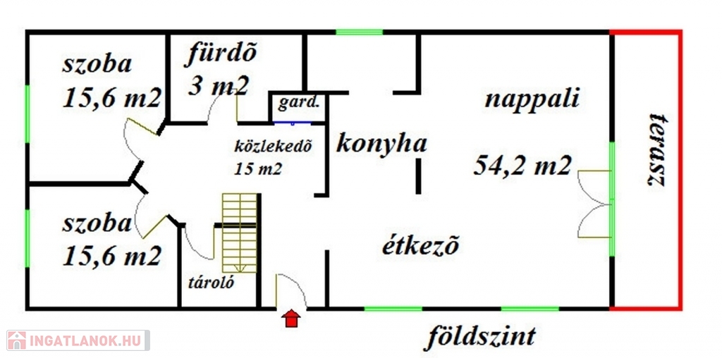 A földszinti részen tágas, terasz kapcsolatos , hatalmas ablakokkal ellátott amerikai konyhás nappali étkezővel, két kényelmes méretű hálószoba, fürdőszoba és egy nagy méretű előszoba beépített gardróbbal kapott helyet.