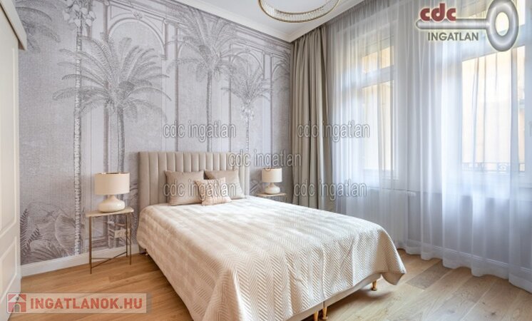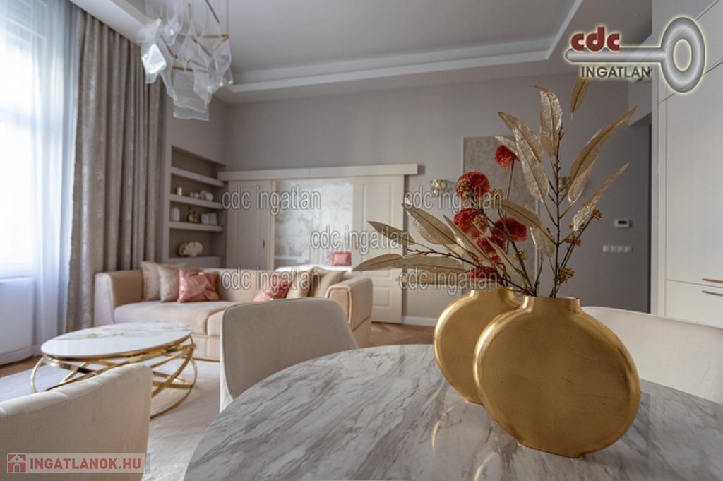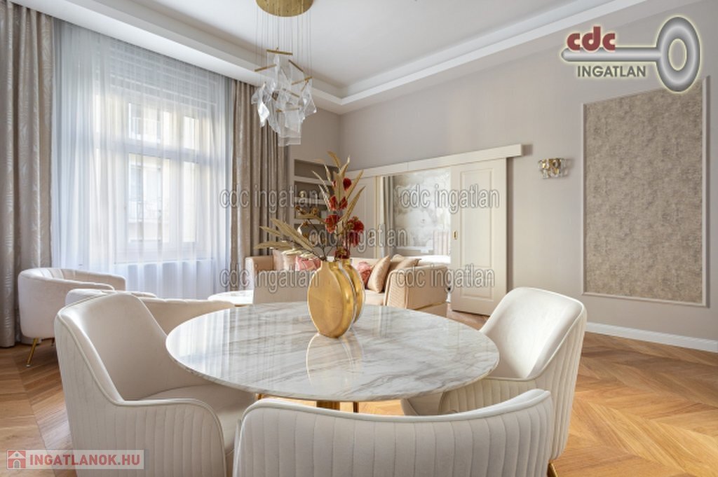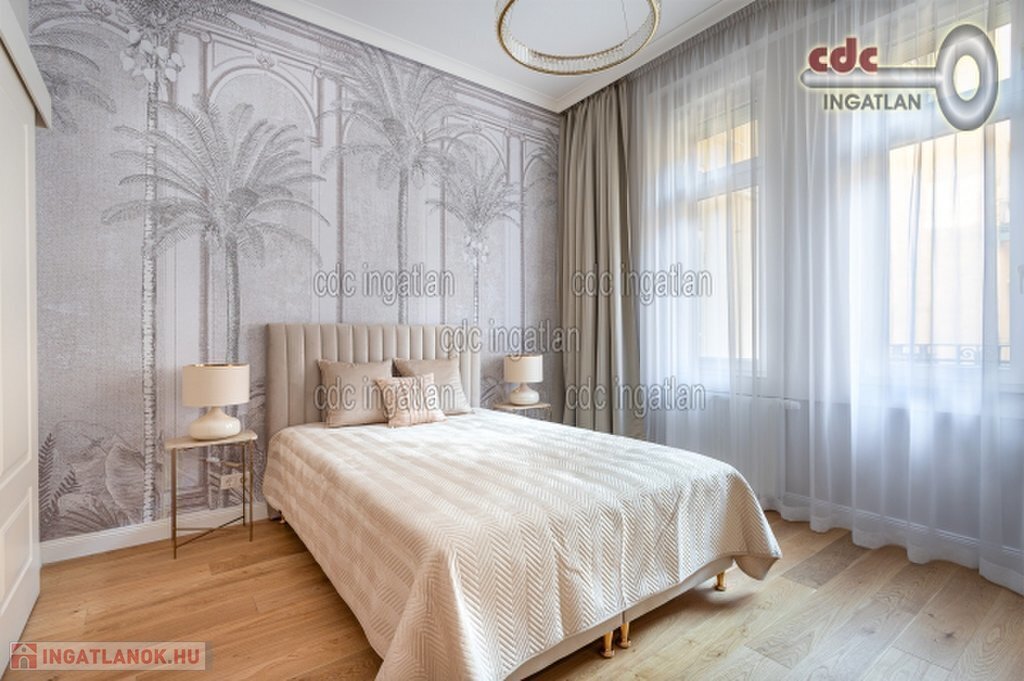Belvárosi elegáns, exkluzív luxuslakás eladó! V. kerületben, a Nyáry Pál utcában, a Váci utca szomszédságában, III. emeleti, 89 m2-es nappali + 2 hálószobás, duplakomfortos, vendég wc-s, luxuslakás eladó. Az ingatlan prémium minőségű felújításon esett át, melynek során a legkiválóbb minőségű anyagokat használták fel, a lakás minden részletében az eleganciát tükrözi. Az ingatlan amerikai konyhás nappalival rendelkezik, a fő hálószoba és a nappali a csendes Nyáry Pál utcára néz, míg a második hálószoba a nyugodt belső udvarra nyílik. Mindkét hálószobához külön fürdőszoba tartozik, a fő hálószobához egy elegáns káddal, WC-vel és bidével felszerelt fürdő kapcsolódik, míg a második hálószobához egy modern zuhanyzós. A lakásban külön vendég WC is található. Az ingatlan prémium minőségű bútorokkal és gépekkel együtt eladó, így az új tulajdonos azonnal beköltözhet egy teljesen felszerelt, exkluzív otthonba. A teljes körű felújítás során új nyílászárók lettek beépítve, valamint minden víz- és villanyvezetékek cserélve lett. Designer csillárok, beépített szekrények, minőségi szaniterek és prémium burkolatok kerültek beépítésre. A 3,6 méteres belmagasság és a chevron tölgyfa parketta különleges, elegáns hangulatot kölcsönöz az otthonnak. A konyha teljesen gépesített, AEG márkájú készülékekkel felszerelt: mosogatógép, hűtő fagyasztóval, sütő, főzőlap, páraelszívó és mosó- szárítógép is rendelkezésre áll. Az ingatlan kényelmét három légkondicionáló és automata redőnyök biztosítják. A fűtés és a melegvíz kondenzációs kazánról üzemel, a közös költség vízdíjat és célbefizetést tartalmaz, melynek összege 42.809.-Ft havonta. Ez a lakás nem csak otthonként, hanem befektetésként is tökéletes választás azok számára, akik a belvárosi luxust és kényelmet keresik. Az ingatlan minden részlete a legmagasabb színvonalat képviseli, így garantáltan megfelel a legigényesebb vásárlók elvárásainak is.