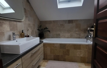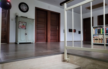 Az emeleten egy tágas, napfényes közös tér házi mozi rendszerrel, 4 erkélyes hálószoba, kényelmes mellékhelyiség, illetve fürdőszoba lett kialakítva.